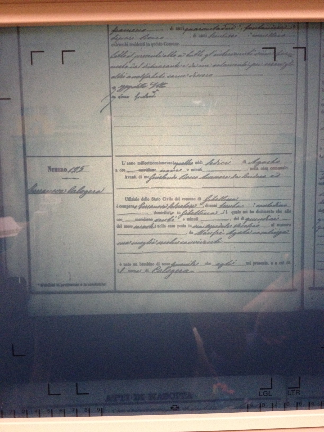 Salvatore Terranova, age 30, peasant farmer residing in Gibellina, to declare that at 8 PM on the 15th of the current month, at the place at Via Ospedale Vecchio, to Agata Manfrè, housewife, his wife residing with him, was born a female child who was presented to the official and to whom was given the name CALOGERA