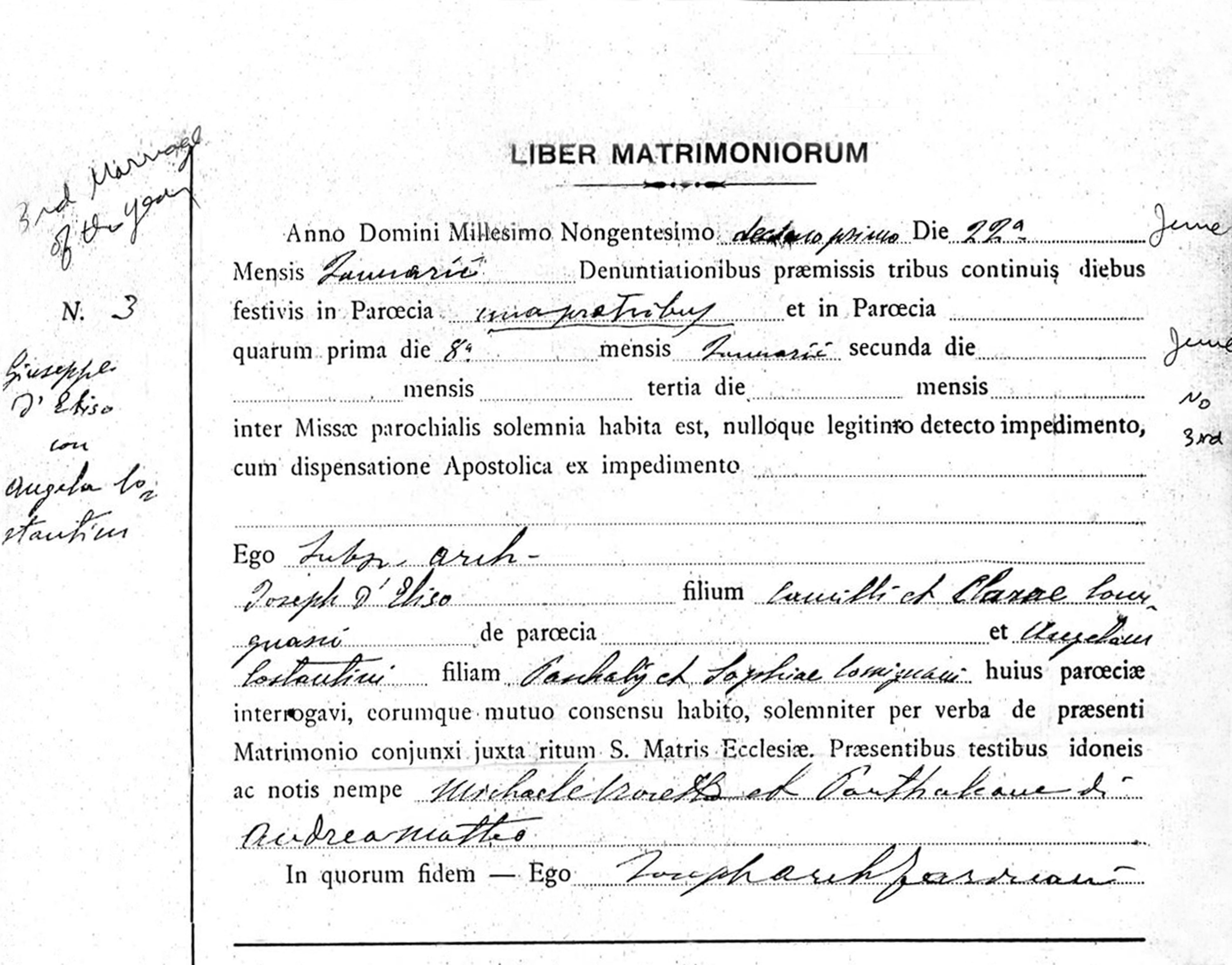 I questioned Giuseppe D’Eliso son of Camillo and Chiara Comignani of the parish (blank) and Angelina Costantini daughter of Pasquale and Sofia Comignani of this parish having their mutual consent, were married according to the rites of the S. (Michele Archangelo) Mother Church. In the presence of suitable witnesses Michele Crocetta and Pantaleone di Andreamatteo. (Today spelt D'Andreamatteo)