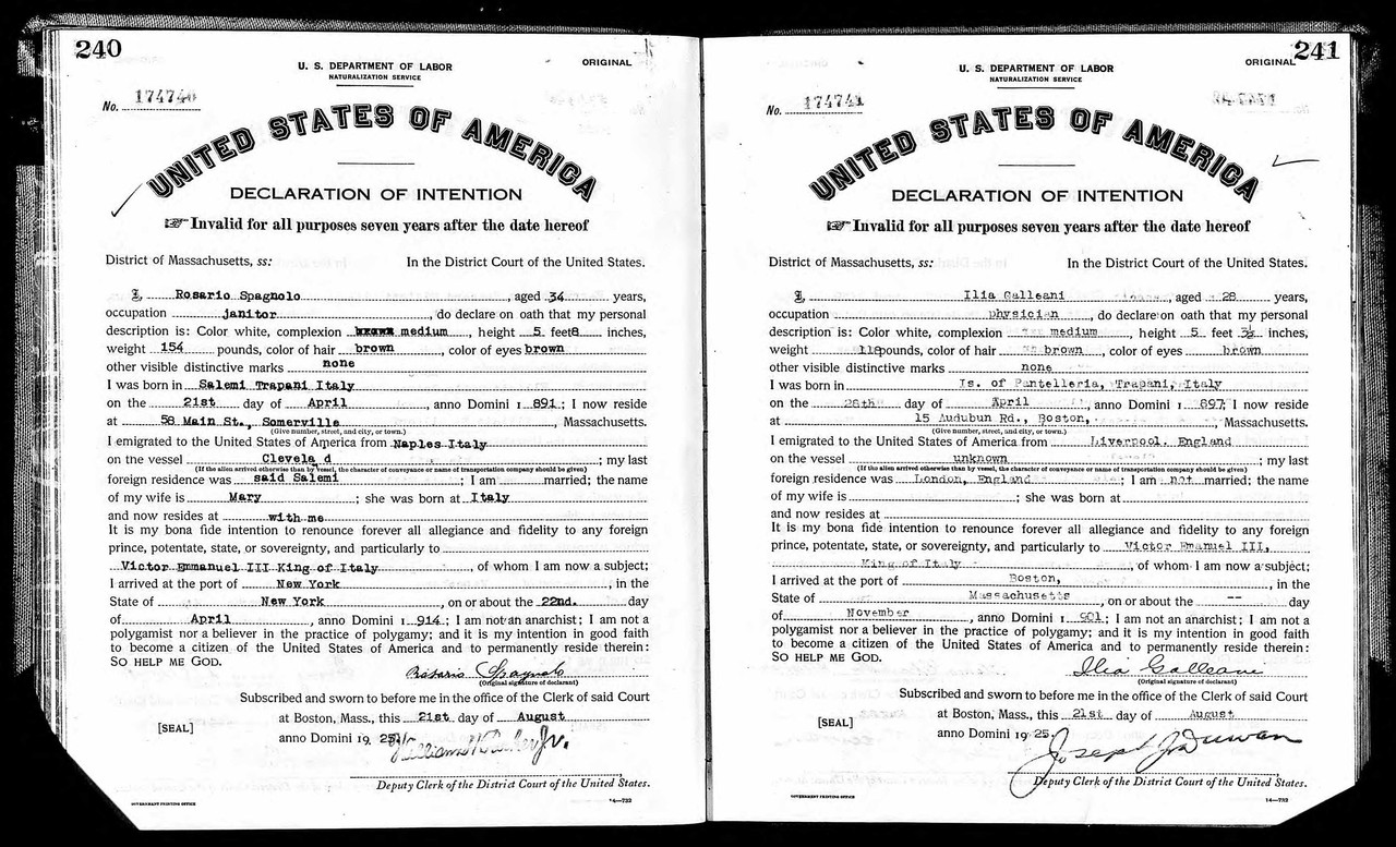 Here is the image of the naturalization Declaration of Intent for Ilia Galleani (in Massachusetts)