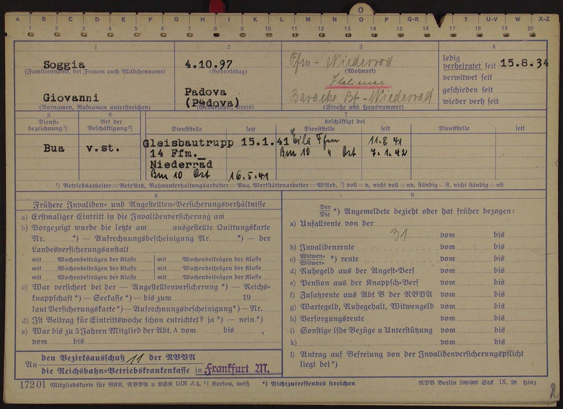 I found Giovanni Soggia born 1897 bargeman in the Padua area in the Europe, Registration of Foreigners and German Persecutees, 1939-1947, a number of documents including his insurance card. Typing in Google translate I believe he may have been in track construction. Does anyone know if he was forced into labour camps and if so why, or had he gone to German voluntarily to work. He appears to have spent the whole of the war possibly in Frankfurt. My German is no better than my Italian unfortunately.