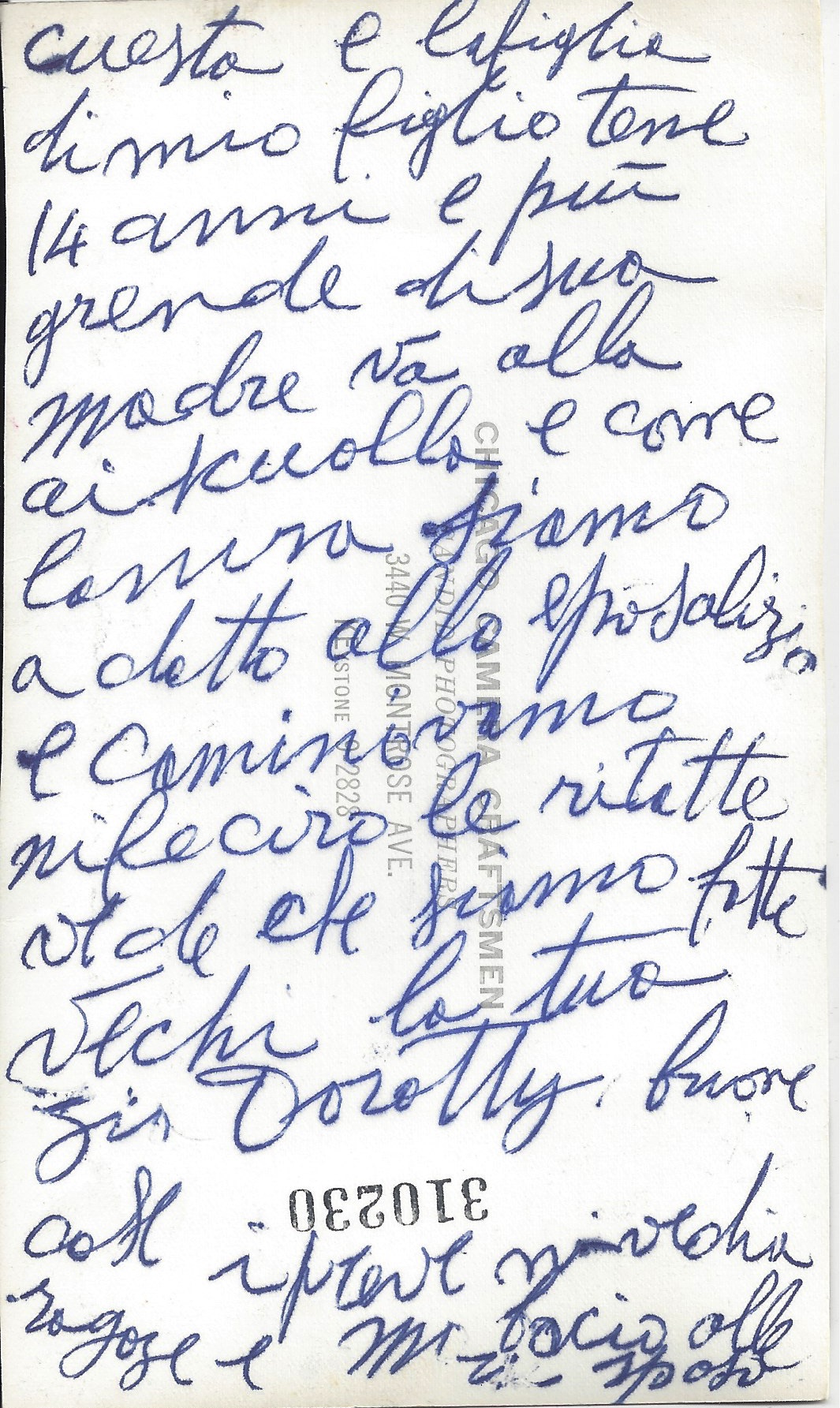 I thought the comments on the rear of the photograph were written by my wife's grandmother as she only spoke Italian and some "broken english." But, her name was Francesca, and my wife has no knowledge of an Aunt Dorothy. Yet, the photo was found in an old box of photos and papers belonging to my wife's mother after she passed away, and I guess I just assumed they were written by her mother (wife's grandmother).