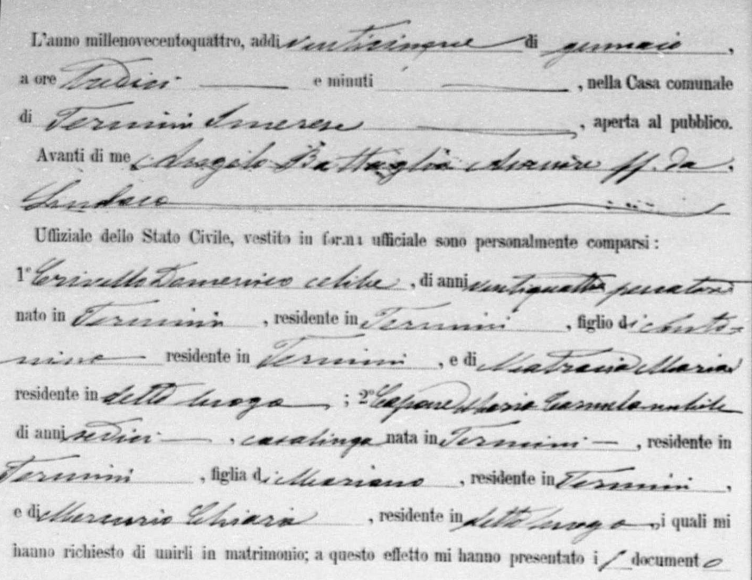 January 25, 1904 at town hall appeared Domenico Crivello, a single man, age 24, born and resident in Termini, son of Antonino (Crivello), resident of Termini, and of Maria Matracia, resident of Termini,