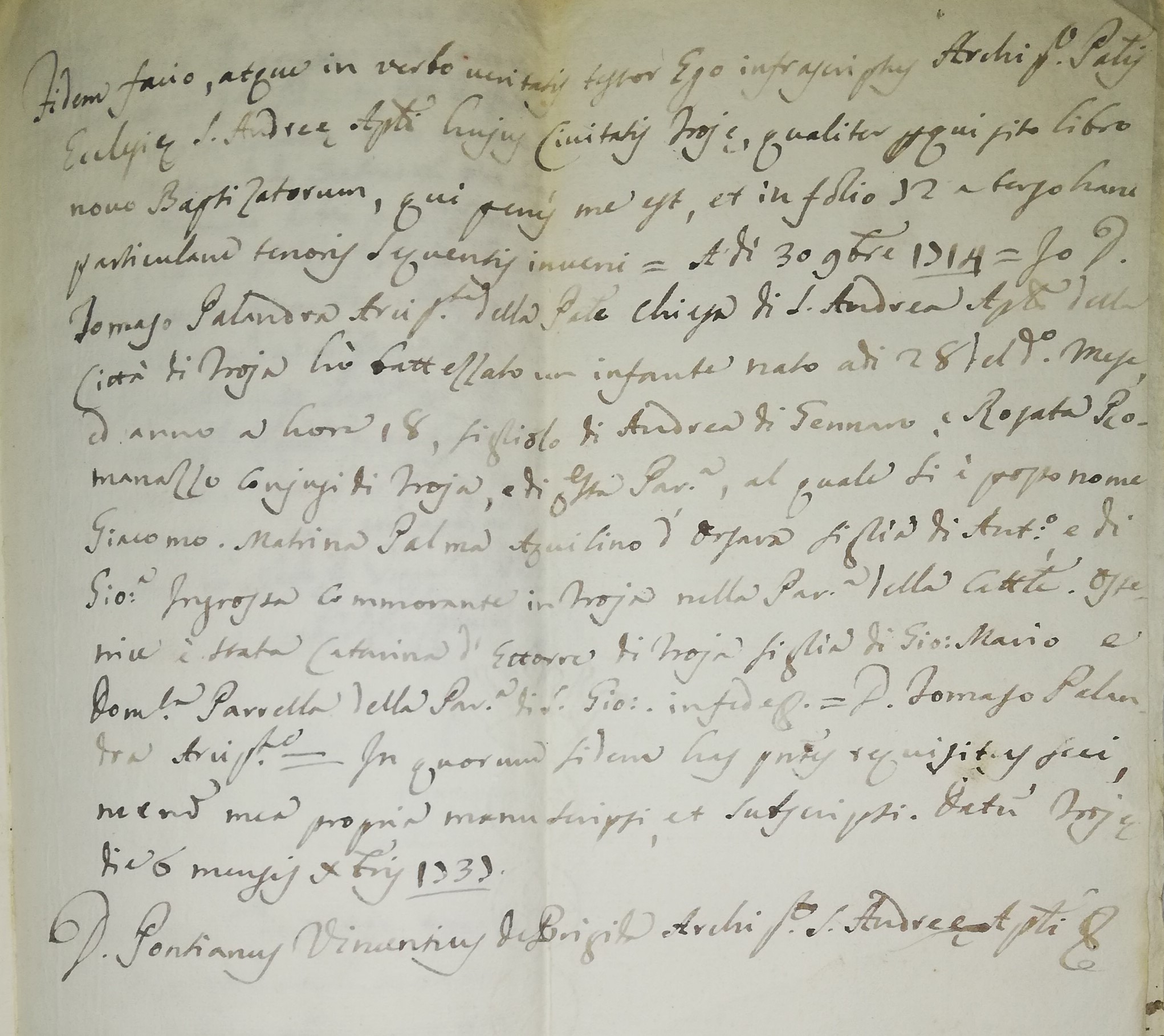 Fidem facio, atque in verbo veritatis testor Ego infrascriptus Archipresbyter Parochialis Ecclesiae S. Andreae Apostoli hujus civitats Trojae, qualiter perquisito libro nono Baptizatorum, qui penis me est, et in folio 12 a tergo hanc particulam tenoris sequentis inveni.= A di 30 9mbre [= novembre] 1714 = Io D. Tomaso Palandra Arciprete della Parrocchiale Chiesa di S. Andrea Apostolo della città di Troja ho battezzato un infante nato a dì 28 del detto mese, ed anno a hore 18, figliolo di Andrea di Gennaro, e Rosata Romanazzo conjugi di Troja, e di questa parrocchia, al quale si è posto nome Giacomo. Matrina Palma Aquilino d'Orsara figlia di Antonio e di Giovanna Ingrosso dimmorante in Troja nella Parrocchia della Cattedrale. Ostetrice è stata Caterina d'Ettorre di Troja figlia di Giovanni Mario e Domitilla(?) Parrella della Parrocchia di S. Giovanni. In fede ecc. = D. Tomaso Palandra Arciprete. = In quorum fidem has praesentes requisitus feci, nec non mea propria manu scripsi, et subscripsi. Datum Trojae die 6 mensis Xbris [= dicembre]1737.