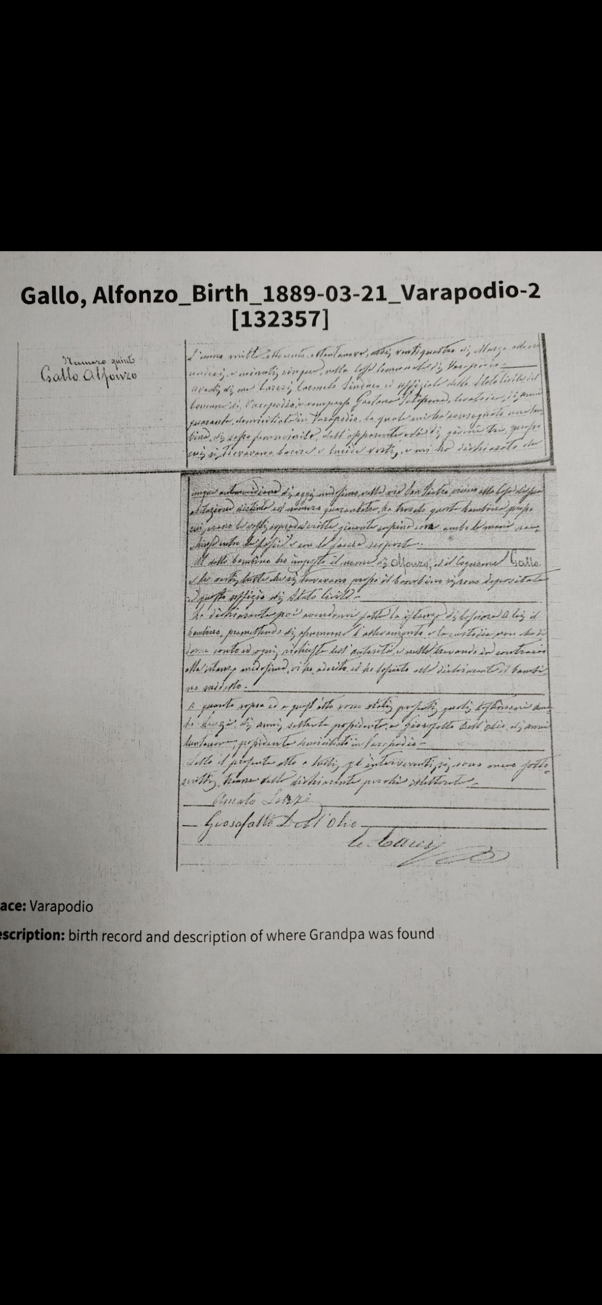 I could use some help with the extraction of pertinent data for this handwritten 1889 birth act from the town of Varapodio for the foundling Alfonso Gallo.
