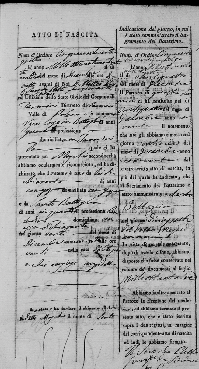 Appearing was Rosa Corso, 40 yo, living in Termini. She presented a male baby born from herself, the declarant, 40 yo, and from her husband Santo Battaglia, 50 yo, Contadino, living with the declarant. The baby was born on 20 December current year at 8 pm in the house they lived. The baby was given the name Santo. (Santo was baptised in Termini but the date given for the baptism precedes his birth so there is obviously an error.)